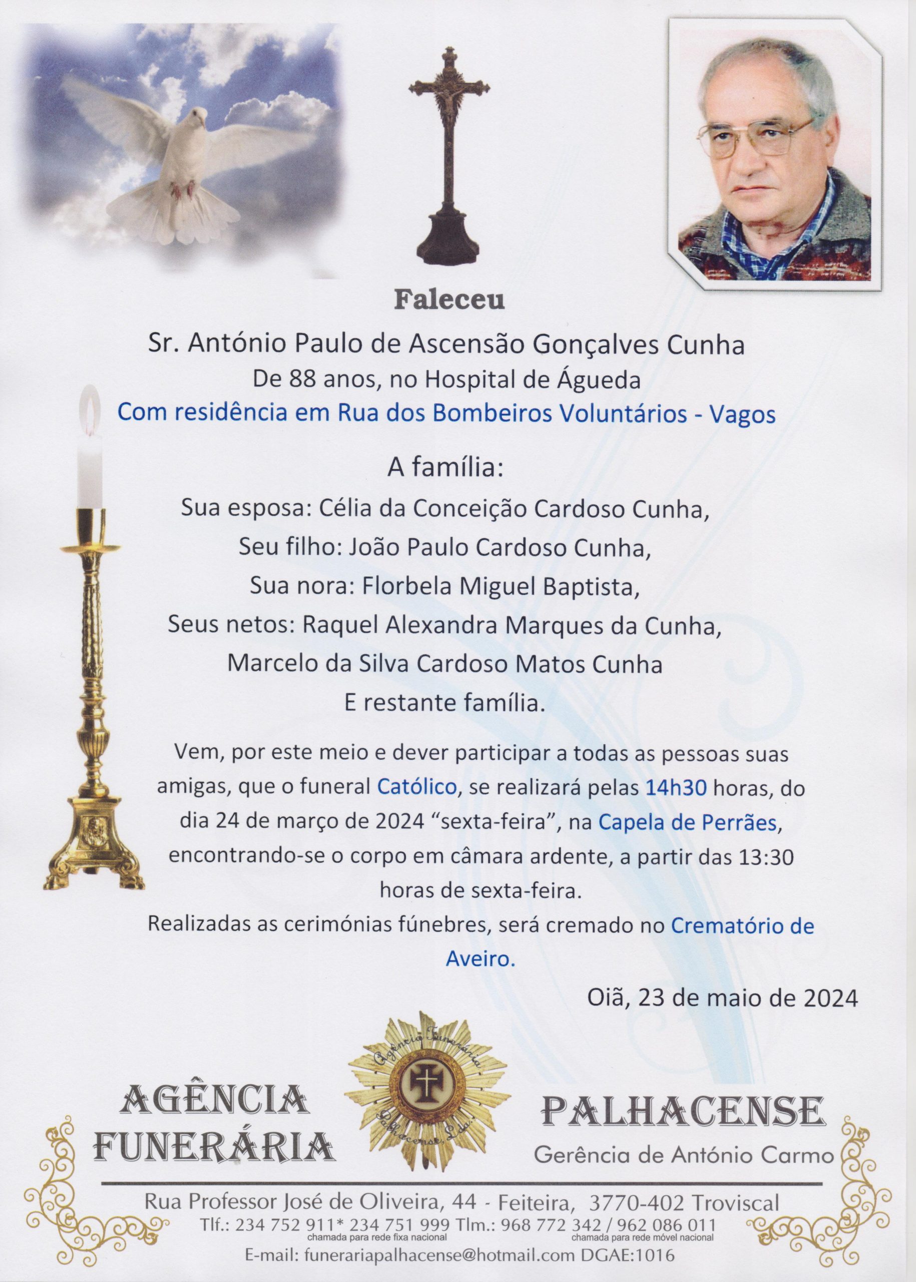 Marido de Célia da Conceição Cardoso Cunha Pai de João Paulo Cardoso Cunha Sogro de Florbela Miguel Baptista Avô de Raquel Alexandra Marques da Cunha e Marcelo da Silva Cardoso Matos Cunha