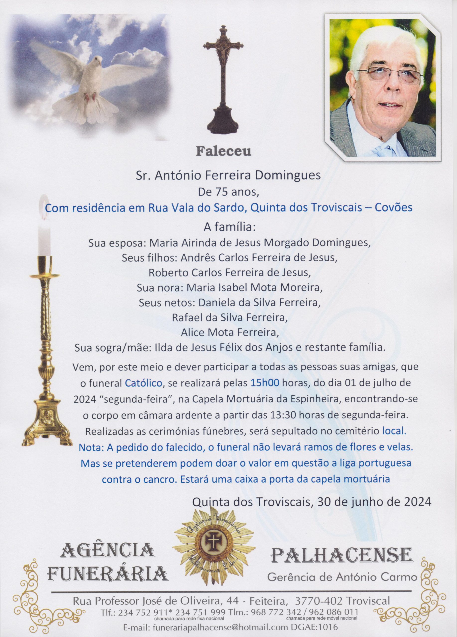 A pedido do falecido, o funeral não levará ramos de flores e velas. Mas se pretenderem podem doar o valor em questão a liga portuguesa contra o cancro. Estará uma caixa a porta da capela mortuária para poderem doar.
