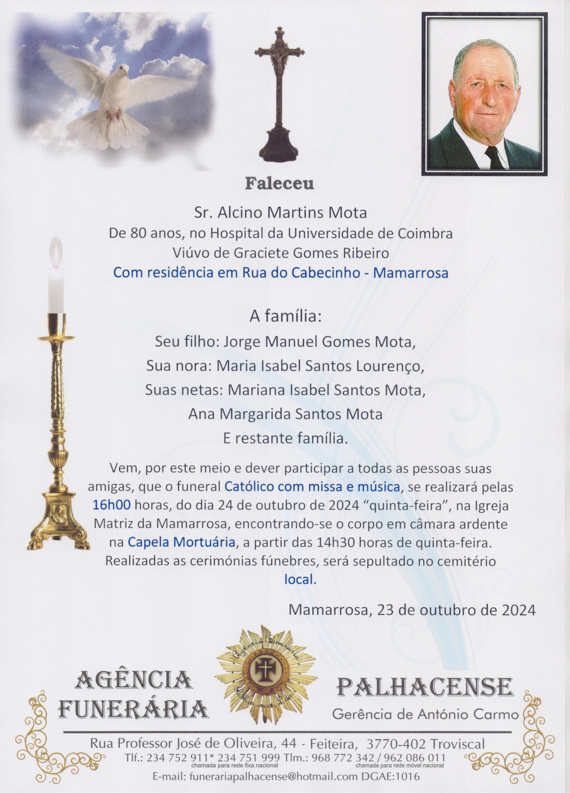 Viúvo de Graciete Gomes Ribeiro Pai de Jorge Manuel Gomes Mota Sogro de Maria Isabel Santos Lourenço Avô de Mariana Isabel Santos Mota e Ana Margarida Santos Mota